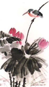 Nr. 19 – »Lotus mit Eisvogel« (Aquarell auf China-Papier, 45cm x 25cm)